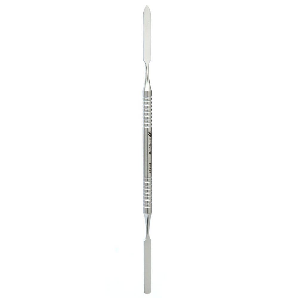 Szpatułka CP717 to profesjonalna szpatułka do manicure i pedicure. Zależnie od preferencji użytkownika nada się między innymi do precyzyjnej aplikacji żelu i akrylu, a nawet do nakładania różnego rodzaju maści. Jest to wysokiej jakości dwustronne narzędzie. Jedno zakończenie jest lekko zaokrąglone, natomiast drugie kończy się łagodnym szpicem.